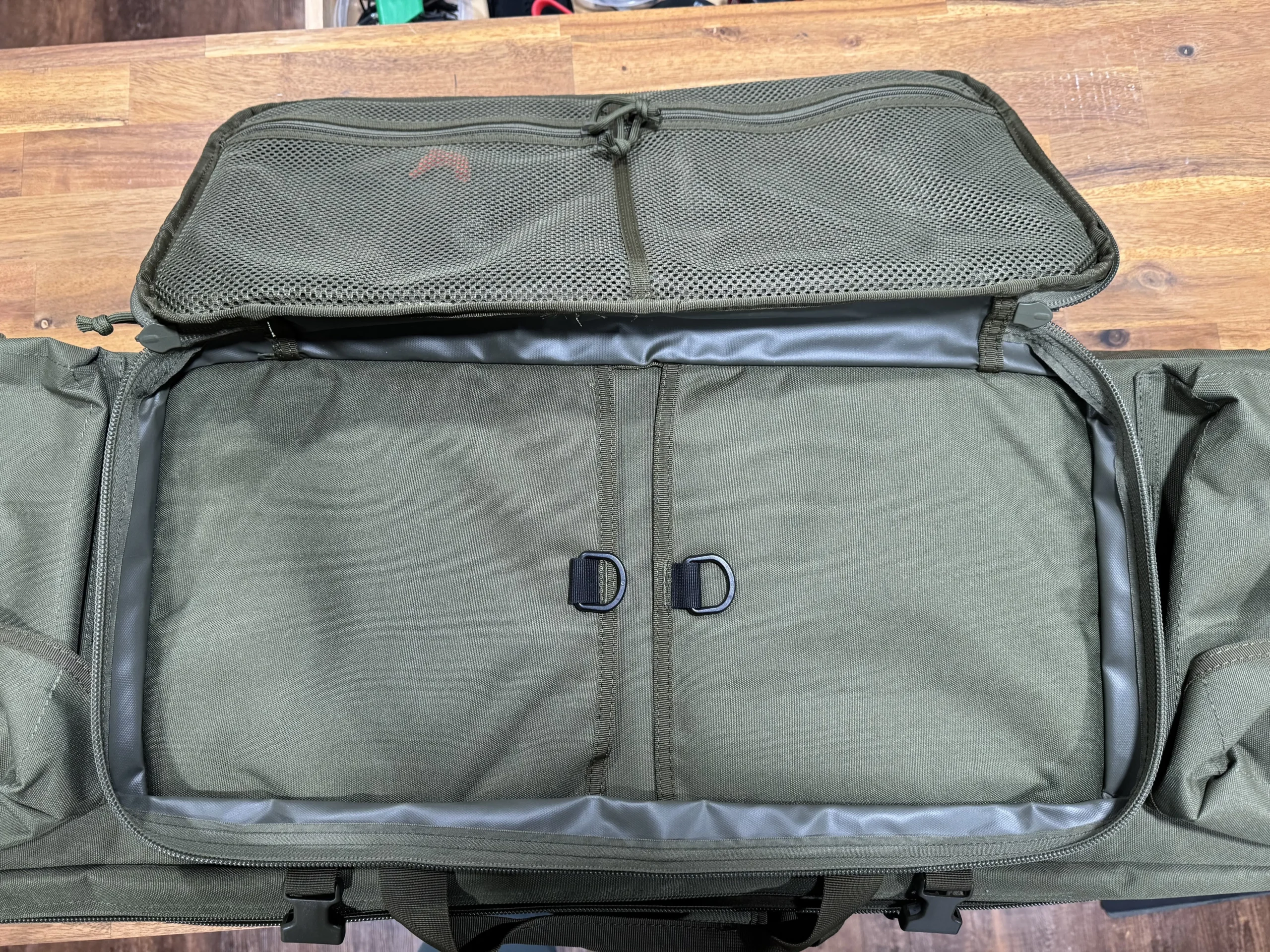 • Secondary Compartment: Equipped with two padded pistol sleeves and two zippered mesh pockets, providing organized storage for handguns and essential accessories.