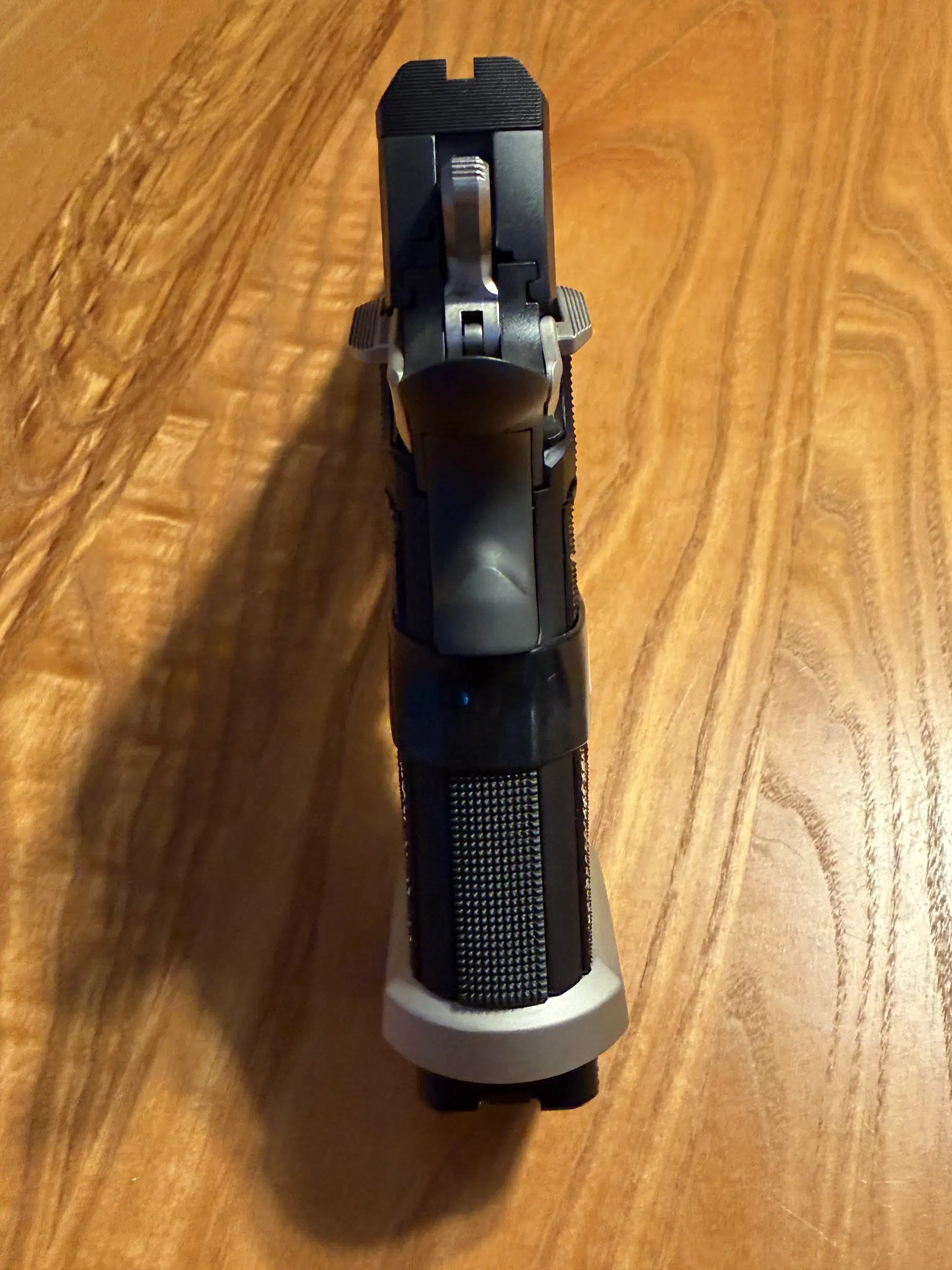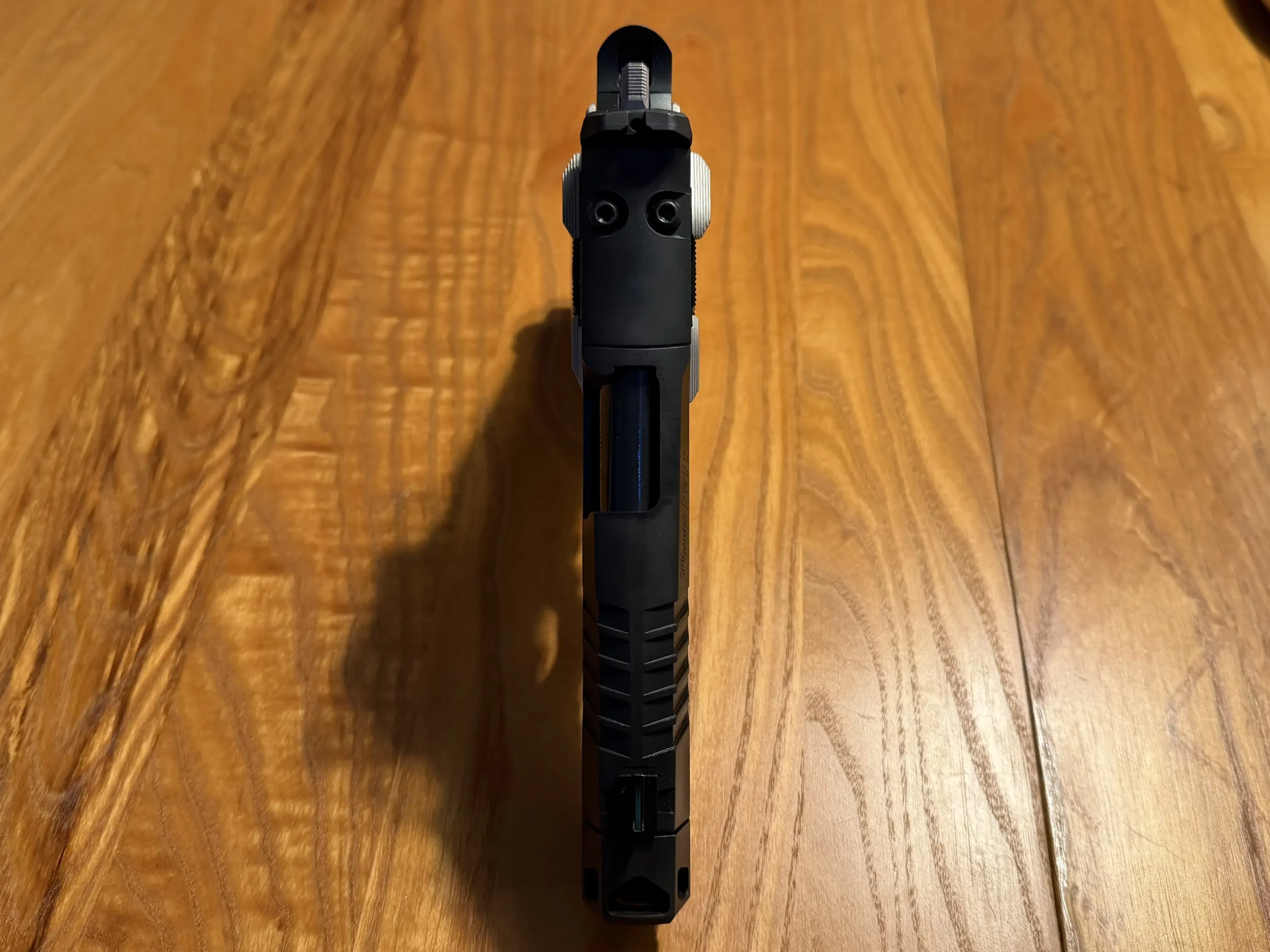 True to the Equinox lineage, this model blends performance with a distinctive two-tone aesthetic. The stainless slide and compensator feature Equinox-polished highlights set against a Nitron base; the controls are E-Nickel for a subtle contrast that remains practical under hard use. Custom Alloy LOK grip panels with the GridLOK texture deliver consistent traction without over-aggression, and the full-length dust cover contributes rail space and forward weight for a flatter impulse.